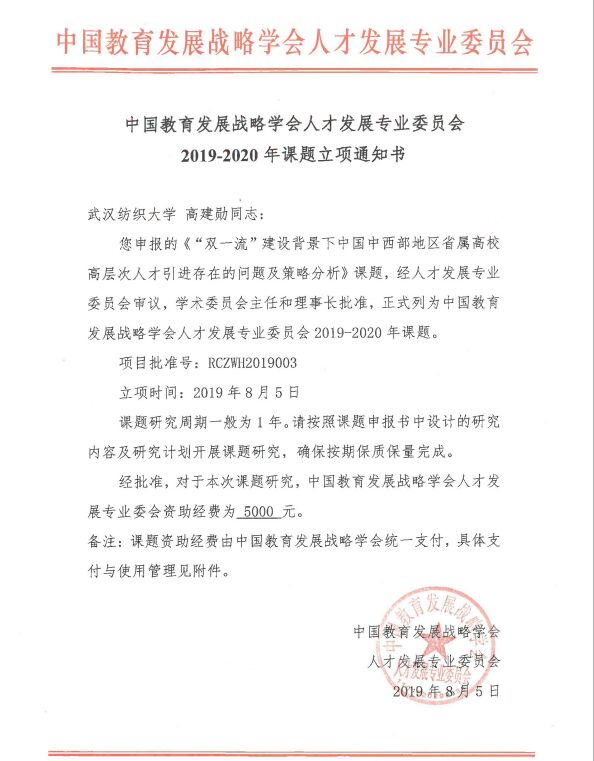 近日,中国教育发展战略学会人才发展专业委员会公布了2019-2020年度课题立项名单,诸侯快讯官网党委教师工作部部长、人事处处长高建勋教授主持申报的《“双一流”建设背景下中国中西部地区省属高校高层次人才引进存在的问题及策略分析》课题喜获立项,获批资助经费5000元。