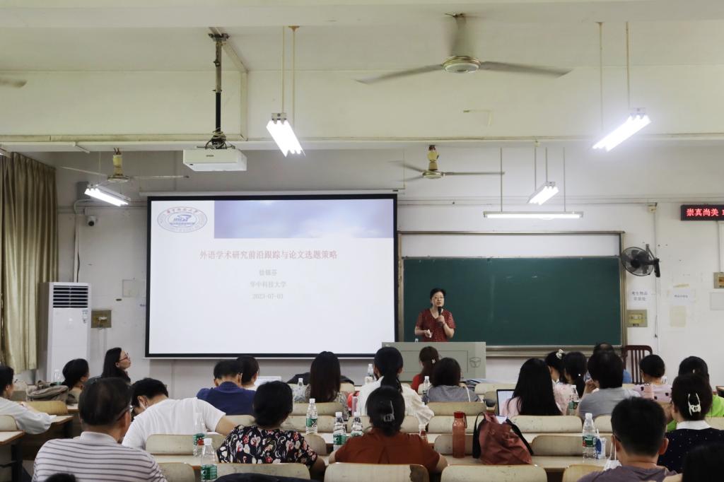 下午,研修班第二讲由华中科技大学徐锦芬教授带来——外语学术研究前沿跟踪与论文选题策略。徐锦芬教授认为,研究除了要注意选题的学术性﹑实践性﹑创新性外,可行性和发展性是语言教学类研究选题容易忽略的因素。根据对一线教师和硕博研究生的调查,徐锦芬教授指出他们在选题角度﹑意义﹑范围﹑价值和问题凝练程度等层面均存在问题。在谈及选题策略时,她强调了大量阅读文献的重要性。她认为作者在立足现实问题的前提下,通过阅读文献才能形成自己的观点和研究内容,确定选题。徐锦芬教授着重以SSCI和CSSCI文章为例,详细阐释了基于案例分析的研究设计与方法。其中,研究设计至关重要,直接关系到研究实验的成败。徐锦芬教授结合具体的选题,从实验室环境的描述性研究,自然课堂环境的定量研究和自然课堂环境的混合研究等三个不同的类型来展示研究设计的过程和设计的内容。在描述类研究中,作者研究设计包括:研究背景﹑研究对象以及研究过程。在第二种类型的研究中,设计前一定要想好以下几个问题,即:研究目的﹑题目的关键词﹑如何获取信息和如何设定问题,并且要思考清楚这些问题之间的内在逻辑性。与描述性研究不同,定量研究的设计包括:背景和理据的介绍,明确每一个步骤和体现严谨性和科学性。在混合式研究中,还要澄清研究方法。需要注意的是,语言教学类的研究不是十全十美的,因此,在论文的末尾,需要写上该论文的不足。最后,徐锦芬教授总结今天的授课内容,研究设计因研究种类不同而不同,科学设计研究,熟悉研究工具,合理使用理论,一定会让我们更好地进行研究从而写出高质量的论文。徐锦芬教授鼓励大家把科研工作作为一个热爱的事业来对待,并列出了相关的经典文献希望老师们坚持阅读。参会老师们都积极提问,利用这次难得的机会,积极向徐教授取经,学习如何做教学类的研究课题,老师们普遍认为,这样的研修机会非常有利于老师们系统学习研究方法,解决困扰自己多年的如何做科研的问题。
