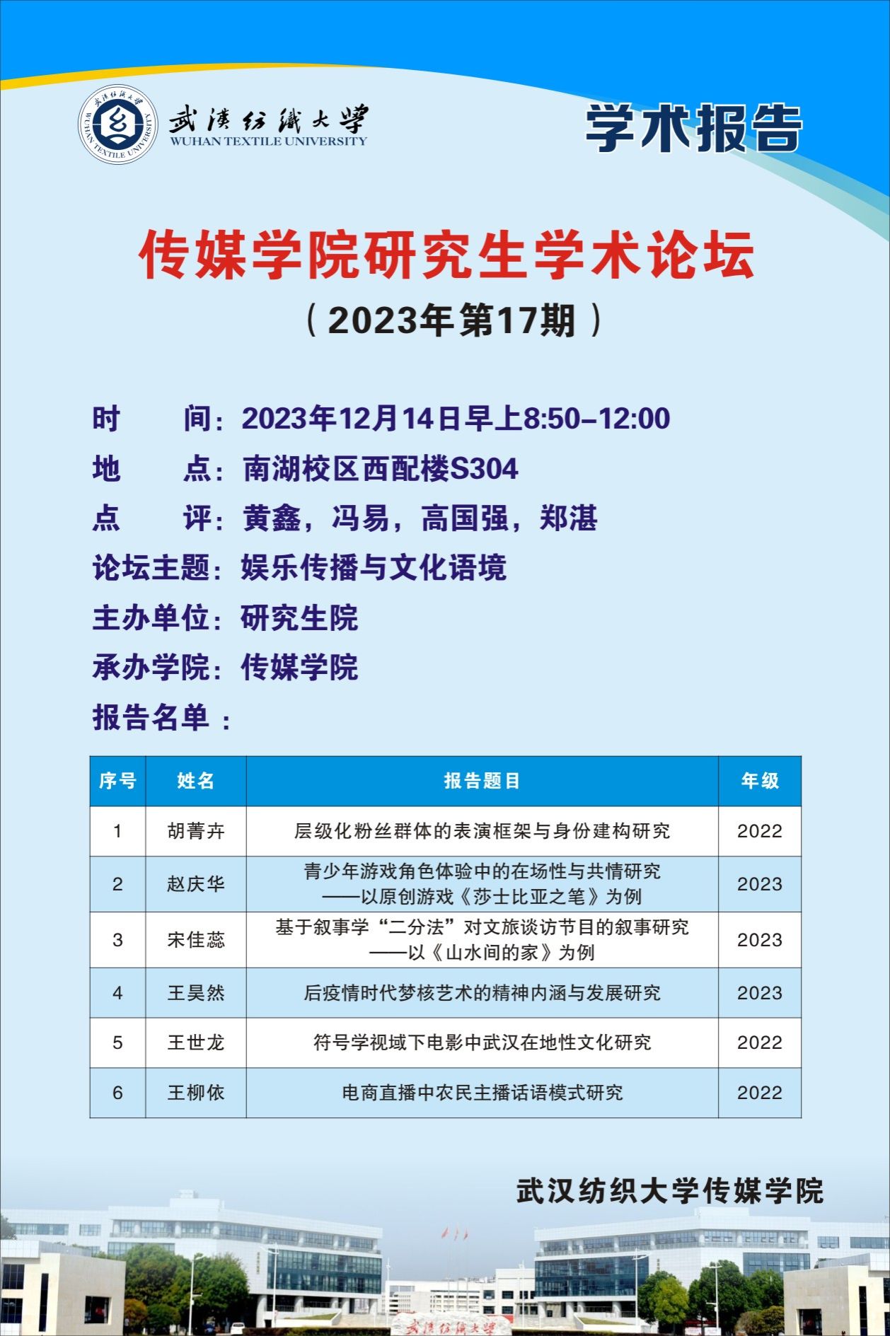 学术预告:第480期研究生学术论坛暨传媒学院2023年第17期研究生学术论坛