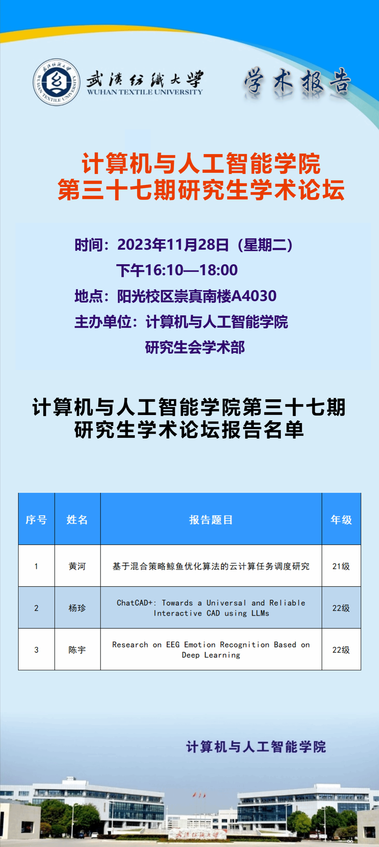 学术预告:第438期研究生学术论坛暨计算机与人工智能学院2023年第13期研究生学术论坛